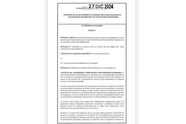 El presidente Gustavo Petro sancionó la Ley 2442 del 27 de diciembre de 2024, conocida como la “ley de divorcio libre” o “ley de divorcio unilateral” en Colombia. Esta nueva legislación introduce cambios significativos en el proceso de divorcio en el país.