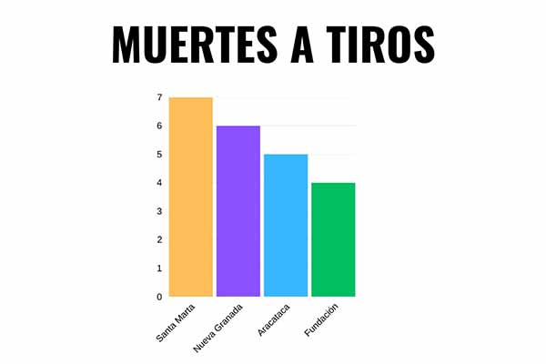 De los 39 casos de homicidios ocurridos en el departamento de Magdalena, siete fueron a bala, seis menos que la registradas en diciembre, seguida por el municipio de Nueva Granada con seis hechos, Aracataca con cinco, mientras que en Fundación y Ariguaní hubo de a cuatro.