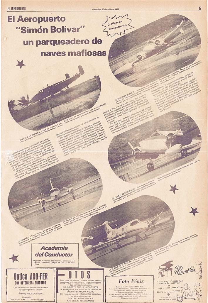 Una crónica publicada por EL INFORMADOR el 20 de julio de 1977, cuando el aeropuerto Simón Bolívar de Santa Marta era frecuentado por avionetas utilizadas para el tráfico de drogas. En imágenes captadas entonces por el reportero gráfico Franco Barros se aprecian diferentes narco avionetas que se encontraban en la terminal aérea de la ciudad.