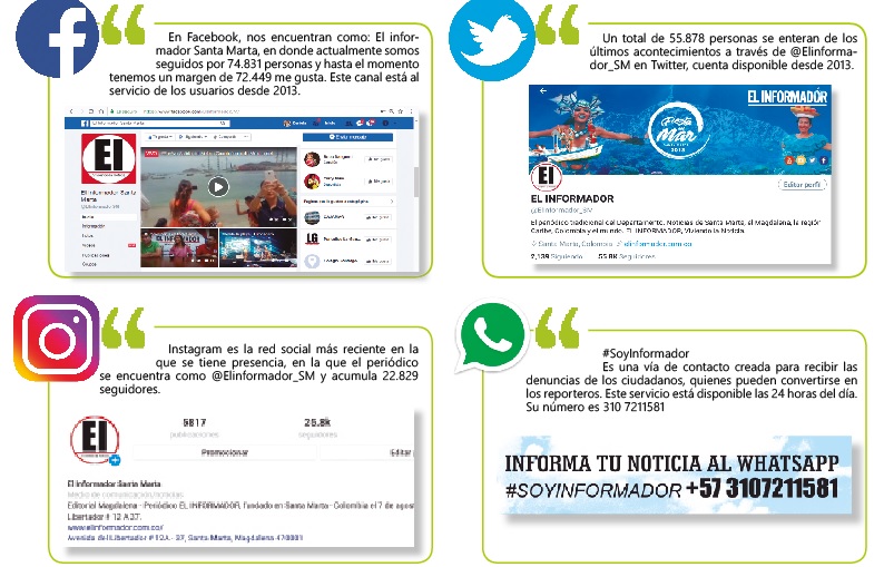 En Facebook, nos encuentran como: El informador Santa Marta, en donde actualmente somos seguidos por 74.831 personas y hasta el momento tenemos un margen de 72.449 me gusta. Este canal está al servicio de los usuarios desde 2013.