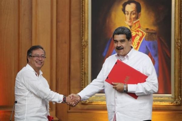 Petro y Maduro se reunieron en privado durante más de dos horas en el palacio presidencial de Miraflores, sede del Ejecutivo venezolano, en lo que supuso el primer encuentro entre ambos mandatarios, que restablecieron las relaciones diplomáticas en agosto, luego de casi cuatro años.