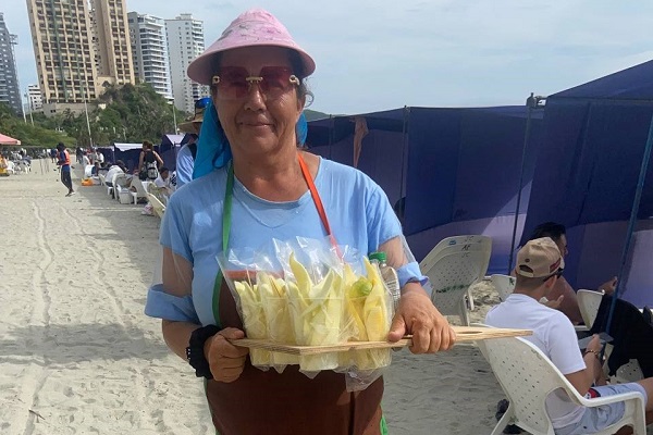 Amanda llega a la playa con sus mangos frescos, cortados y listos para disfrutar. Su caminata diaria de 20 minutos, ida y vuelta, por la orilla del mar no solo es un ejercicio físico, sino una tradición que ha cultivado con dedicación y cariño. Los precios de sus mangos varían, empezando desde 5 mil pesos, haciendo de sus productos una opción accesible y deliciosa para todos los que visitan la playa. Amanda sabe que cada cliente tiene diferentes gustos y presupuestos, por lo que siempre está dispuesta a ofrecer algo que se ajuste a las necesidades de cada persona "Me siento satisfecha por mi trabajo, además por complacer a los clientes con una fruta tropical y que a la vez es tradicional", comentó Amanda.