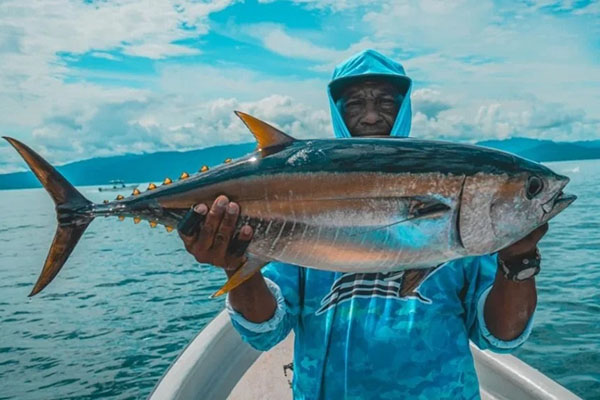 Un pescador mostrando a la cámara un gran pez conseguido en la faena del día. Foto AunapSituación en Colombia y el Caribe