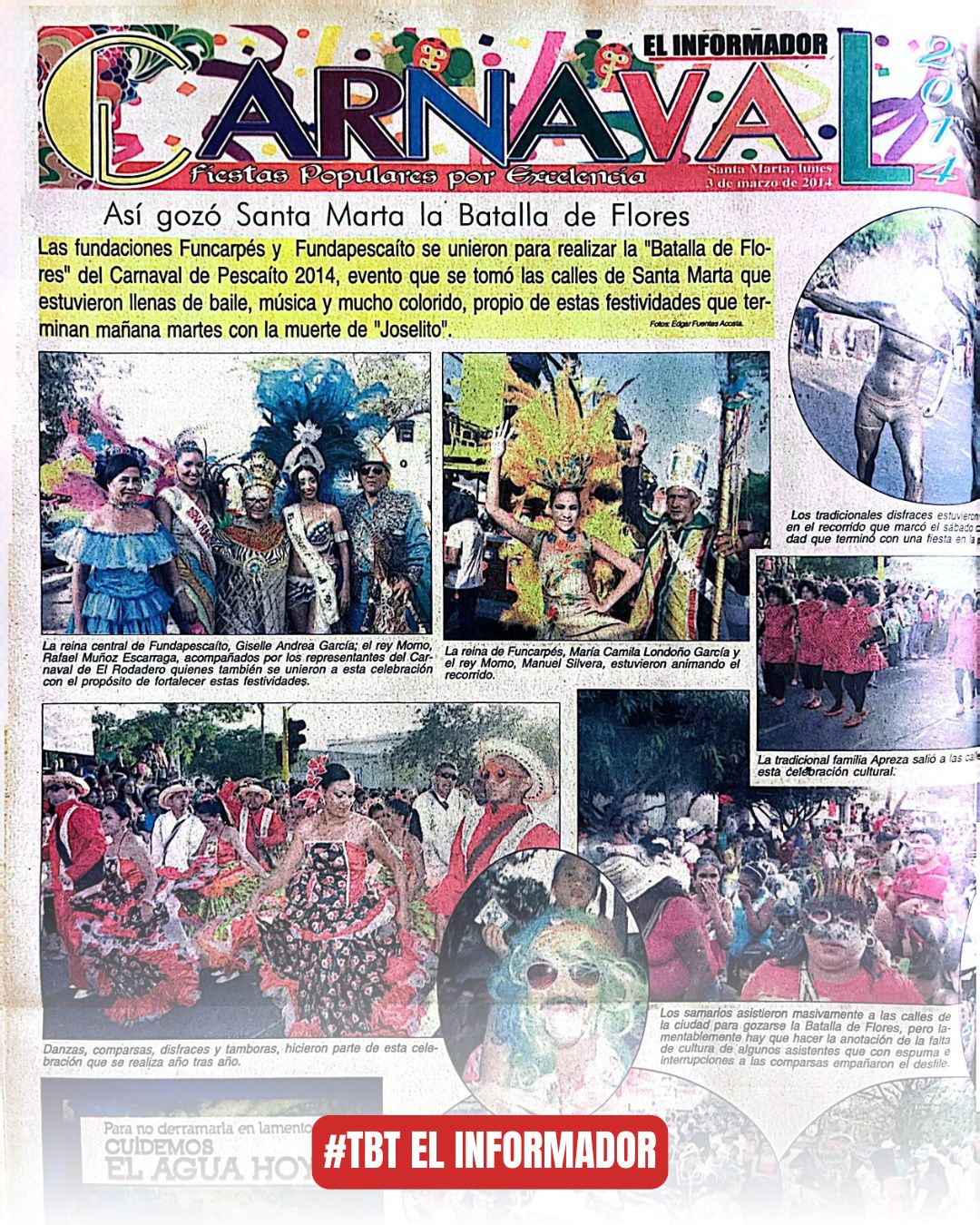 Las imágenes publicadas en la edición impresa del 2 de marzo de 2014 de ‘EL INFORMADOR’ retratan cómo se vivía el Carnaval en Santa Marta desde la tradición y la participación ciudadana. La Batalla de Flores del Carnaval de Pescaíto, liderada por las fundaciones Funcarpes y Fundapescaito, aparecía entonces como una de las expresiones culturales más representativas de la ciudad.